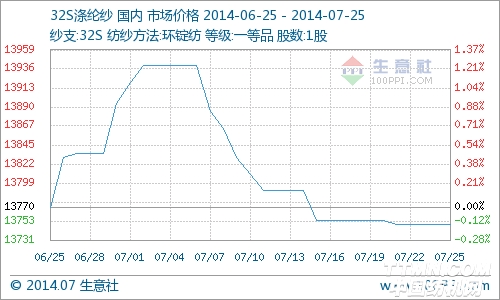 上游涤纶短纤价格受到成本支撑,止跌企稳,整体行情稳中偏强,但成交多以小单补货为主。下游纱布市场需求仍没有明显改善,但受到库存消耗影响,纯涤纱价格依然平稳运行。32s大化纯涤纱目前主流报价13600-13700元/吨左右。