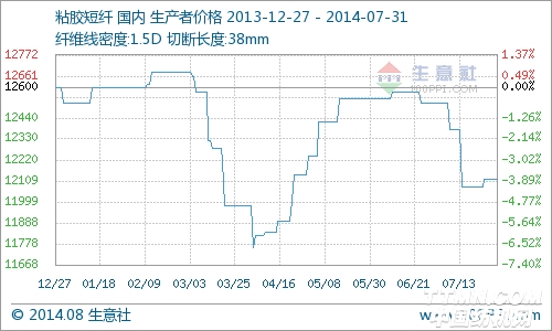 7月31日,山东地区粘胶短纤1.2D×38mm报价在12200元/吨,市场交投气氛偏淡,前期价格调整之后新单成交量偏低,企业开工率将降低,目前大多数企业的库存量只有一周。