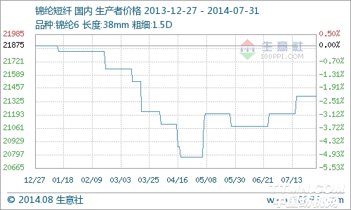 7月31日,湖南地区锦纶短纤1.5D×38mm报价在21500元/吨,价格较上周一致。目前原料市场价格持续上涨,使得厂家压力不断,开工率在7成左右,库存压力不大,市场成交氛围不浓。