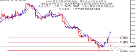 欧元兑美元昨日窄幅震荡,目前价格跌破1.3400整数位后弱势盘整,指标短线背离钝化,价格连日下行有超卖迹象出现,今日晚间数据公布后关注能否突破均线压制展开反弹,上方阻力1.3420-1.3450,未有效突破前维持弱势,下方区间内低吸高抛等待突破,支撑1.3350-1.3380。