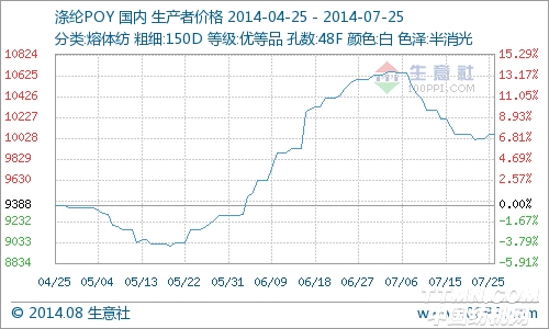 国际原油继续下跌,PX高位震荡,PTA受到工厂限产提价,66%附近的低开工率及7月结算价高企影响,本周小幅上涨,周涨幅0.43%。目前处于纺织淡季,下游织造、加弹企业开机率有所下降,对原料市场观望心理浓重,采购气氛谨慎。