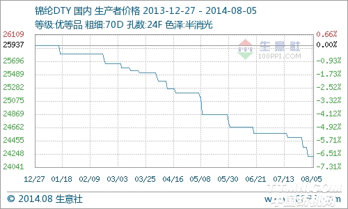 8月5日,浙江某厂家锦纶DTY70D/24F目前报价在24000元/吨,价格较上周一样。目前原料市场小幅回落,厂家压力减弱,但是下游裤袜市场交易气氛仍疲弱。