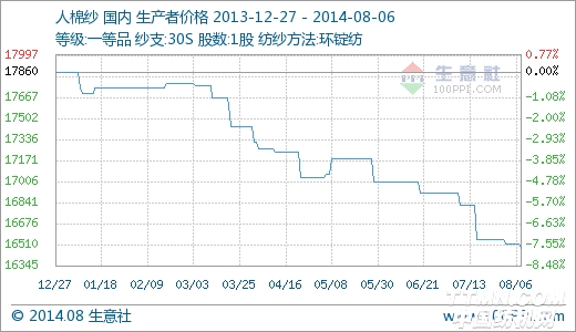 8月6日,江苏某厂家人棉纱30支价格在17000元/吨,价格较前期下调200元/吨。目前原料市场价格坚挺,终端市场行情清淡,下游采购情绪不佳。