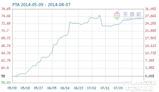 8月6日PTA交收指数为74.13,较昨日下降了0.08点,较周期内最高点101.75点(2011-09-22)下降了27.14%,较2014年05月11日最低点58.49点上涨了26.74%。(注:周期指2011-09-01至今)