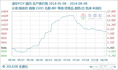 上游聚酯原料价格高位震荡,国内PX开工率在7成多,受外盘价格的拉动,国内对PX市场价格小幅上涨,周涨幅0.41%。PTA现货震荡为主,市场心态偏弱,贸易商持货谨慎,货源紧缺,目前工厂负荷维持在63%左右,周跌幅0.22%。下游布市处在盛夏淡季,坯布库存逐渐上升,资金压力或多或少凸显,对涤丝采购动作仍有谨慎。