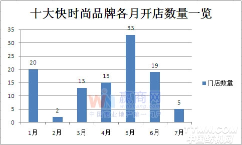 2014年7月份十大快时尚品牌内地门店拓展情况进行了盘点,从今年7月的拓展情况来看,快时尚开店节奏在本月进一步减缓。5月十大快时尚品牌共开了33家新店,6月开了19家新店,7月则仅开了5家新店,是继2月后,今年以来开店最少的月份了。H&M开2家新店,优衣库开三家新店,一共5家新店。GAP、ZARA、I·T、MANGO、UR、C&A等7月份无新开门店。