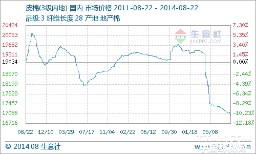 根据生意社价格监测,本周国内棉花现货市场行情继续下跌,创近三年历史新低,目前市场上3级地产棉市场价格为17001元/吨,较3年同期相比跌幅超10%。国储棉收储政策终止,庞大的国储棉量,目标价格补贴细则也一直尚未发布,整个棉花市场观望心态浓郁。国内各主产棉区棉花进入坐桃高峰期,近期已有棉企开秤收购籽棉,但由于目前新花采摘量有限且收购价格低于棉农心理预期,棉企收购量较小。面对8月底即将结束的棉花抛储,多数棉企仍在观望,并未出现大规模补库现象,甚至有个别厂家准备在抛储结束后停工,待新棉上市时再作打算,棉纱降价销售仍是主流。生意社分析师余淑琴认为,近期直补补贴尚未结果,需求面清淡,行情仍以弱势为主。预计随着8月底国储棉抛储结束,新棉大量上市将在10月份前后,面对棉市的“青黄不接”,行情或有小幅反弹。