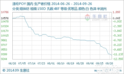 根据生意社价格监测显示,本周涤纶长丝市场行情继续偏弱,FDY跌2.09% %,POY跌1.33 %,DTY跌1.07%。工厂实际出货时让价普遍存在,尤其是涤纶POY让幅相对较大些。但在后半周,受到原料市场提振影响,产销略有回升,优惠幅度有所减小。 上游方面,本周PTA行情小幅反弹0.09%,工厂24日纷纷低位出台结算价,并且企业之间结价差异显现,说明价格联盟名存实亡,PTA开工率明显提升至62%左右,供应量增加;PX整体保持下跌趋势,但近日在需求回暖的提振下止跌反弹。目前虽然下游喷水织造、经编、圆机开机率维持稳定,但是采购也处在按需补货为主。 生意社分析师夏婷认为,随着国庆节长假临近节前备货,再加月底补仓以及上游原料PX止跌反弹。因此近期涤纶长丝的成交量将有上升态势,价格或呈止跌企稳态势。