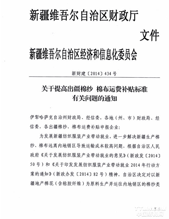 《关于提高出疆棉纱 棉布运费补贴标准的通知》 ——(新财建[2014]434号)