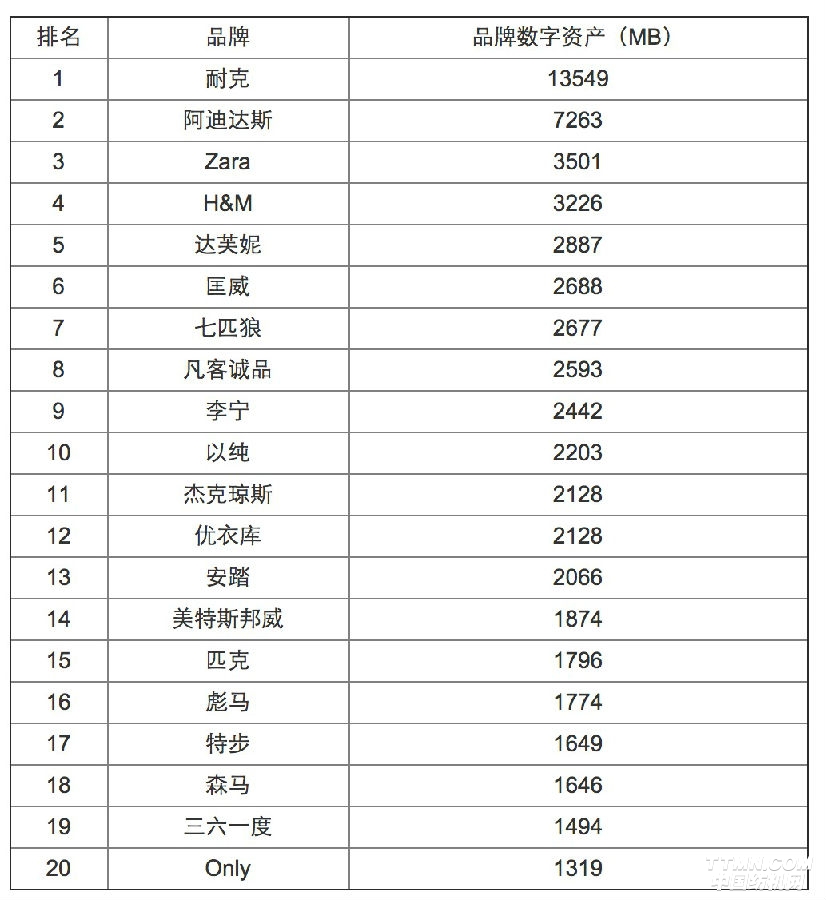 2014年中国服饰品牌数字资产Top 20 耐克排名第一