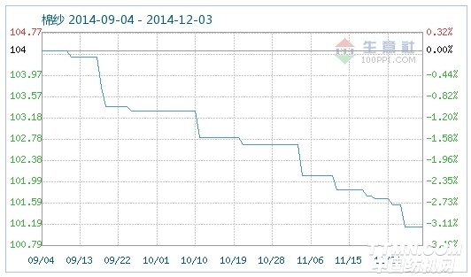 12月3日棉纱商品指数为101.04,较昨日下降了0.09点,较周期内最高点110.06点(2014-02-16)下降了8.20%,较2012年09月25日最低点99.28点上涨了1.77%。(注:周期指2012-09-01至今) 根据生意社价格监测显示,近期国内棉纱市场一直呈小幅下跌态势,全棉纱整体较上周下跌了200元/吨。山东、江苏等地的棉纱企业对目前国家棉市政策处于观望态度,对未来的行情走势很是迷茫,悲观情绪较浓。棉农方面叫苦不迭还有惜售心态,下游纺企采购欲望消沉,按需采购为主。生意社分析师认为,近期棉纱市场仍将保持小幅走弱态势。