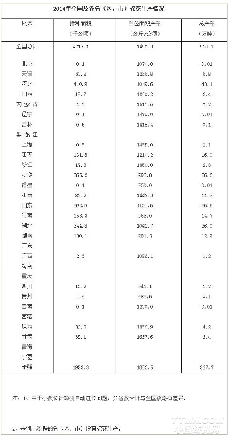 根据对全国31个省区、市的统计调查,2014年全国棉花播种面积、单位面积产量、总产量如下: