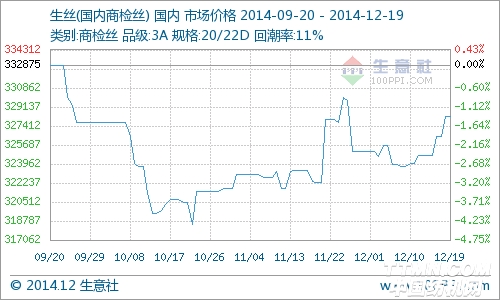 据生意社价格监测,本周五(12月19日)国内3A级商检生丝报价在32.825万元/吨左右,与周一(12月15日)32.475万元/吨相比,价格上涨,涨幅1.08%。 二、影响因素分析: 本周3A级生丝报价小幅上涨,嘉兴茧丝市场3A级商检生丝报价在30.7-33.3万元/吨左右,广西茧丝市场3A级商检生丝报价在32.5-34.8万元/吨左右。 生丝原料干茧价格小幅上涨,周初价格9.9万元/吨,周末价格9.925万元/吨,较周初价格上涨0.25%;下游消费市场低迷,基本面延续偏弱格局,国储丝收放储报价开启,茧丝市场有所回暖。 进入年尾,行情进一步平淡,市场观望氛围较浓,国内消费市场低迷,出口形势不利,厂家库存较为充足,行业整体走势难言乐观。 三、后市预测: 生意社纺织分析师认为,目前情况下,2014全年年总体走势仍将处于下行通道中,短期来看,下游需求不见好转,收放储尘埃落定,但对行情影响有限,近期茧丝依旧弱势难改,延续弱势格局。