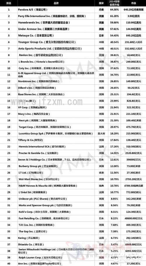 2015年即将来临,记者推出了2014年度时尚产业总结系列。这一期我们关注谁是时尚产业资本市场的领头羊。股票市场的表现好坏一定程度反映了一个品牌的业绩和成长预期,记者抽样了全球的100只时尚产业股票,按资本成长推出年度时尚产业股票排行榜。