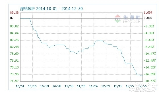 据生意社价格监测,12月30日涤纶短纤商品指数为73.06,与昨日持平,创下周期内的历史新低,较2013年09月04日最高点101.81点下降了28.24%。(注:周期指2013-04-01至今)