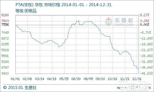 2014年PTA价格依旧熊途漫步,根据生意社价格监测显示,2014年PTA跌幅超过37%,创下近五年以来的历史新低,虽然在下跌通道中有波强势反弹,但在产能过剩背景下,未能改变下跌格局。并且下半年,受国际原油价格大幅下的拖累下,PTA价格走势更是雪上加霜,进入4000元/吨时代。 具体来看,主要分为三大阶段, 第一阶段:1~4月大宗商品市场弱势、PTA库存增加、下游产销疲弱等利空因素影响,除了3月底4月中旬PTA装置检修带来的小波反弹外,总体价格下跌为主。一季度,商品市场弱势明显,多数品种单边下挫,聚酯产业链产品弱势明显,PTA市场也未能幸免。 PTA库存增加,市场心态不佳。自从去年11月中旬开始,国内PTA生产商为了占有较多的合同份额,整体开工负荷大幅提升至85%附近的高位,加之2月初正值春节长假,PTA生产商库存有增无减。 同时下游聚酯需求不足,春节之后,聚酯企业的经营情况未有丝毫改善,库存高企,产品滞销,利润水平不佳,装置的开工率也是难以提升。 第二阶段::5月集中限产提价,成功助推价格。由于利润空间被压缩,5月中上旬PTA主要生产企业逸盛石化、翔鹭石化及恒力石化联合限产保价使得现货货源偏紧影响,国内开工率一直维持在60%附近的相对较低水平,下游聚酯企业装置负荷始终维持在73%附近水平,PTA库存水平较低且合同供给量不足。 于此同时,亚洲PX整体开工率在65%偏低水平,现货供应偏紧。同时长期以市场均价为定价基准的结算模式转为成本定价,定价模式的改变使得PX价格节节走高,成功助推PTA三个月的上涨行情,根据生意社价格监测显示,5月12—8月12日短短三个月时间,PTA上涨近27%%。 第三阶段:PTA产业联盟解体,原油暴跌,PTA惨遭拖累大幅下挫。“联盟”不攻自破,PTA合约1409进入交割期,但从交割仓单来看,其中交割大部分为某一石化厂家品牌,而该石化厂家也是此次限产联盟中关键一员,此外,此次限产保价中的一项重要条件是减少现货流入交割仓库,通过期市调节现货市场价格。同时该厂家8月的开工率一直保持在80%附近,这显然高于挺价联盟协议中约定的开工负荷。 2014年国庆假期期间,受OPEC机构对全球石油市场的需求预期下调,欧佩克原油日产量大增,美元持续强劲及沙特降价保市场份额等影响,国际原油价格一路下跌。目前来看,由沙特主导的OPEC国家思路很明确,借助低成本优势,坚决不减产。伊拉克近期表示计划将2015年原油日产量提升50万—100万桶至400万桶。可见,OPEC国家原油产量将继续保持高位,后期还有增产的可能。在当前供需因素失衡且看不到改善的局面下,原油价格持续下跌。