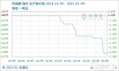根据生意社价格监测显示,本周(1月5-9日)国内丙烯腈市场行情继续下跌为主。工厂方面报价小幅下调,目前像安庆石化报价在14100元/吨,抚顺石化报价在13400元/吨。装置方面,月初上海赛科年产26万吨丙烯腈装置停车检修至月底,安庆石化装置开工在6成左右,抚顺石化装置开工9成附近。 上游丙烯行情略有反弹,下游腈纶市场淡稳为主,腈纶纱厂开工不高,市场需求疲软,导致腈纶厂家出货一般,行业整体库存增加。原料丙烯腈周内大幅下跌,腈纶成本压力略有缓解。 生意社分析师认为,目前丙烯腈市场利空因素较多,一、山东科鲁尔新产能对市场造成的冲击,尽管国内部分丙烯腈装置已开始检修,行情也难逃新产能增加的拖累;二、国际原油走势总体偏弱为主,成本端支撑不足;三、下游买家观望按需采购为主,需求疲软。预计近期丙烯腈市场弱势难改,价格仍将继续下行探底为主。