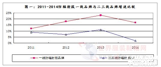 防辐射服是特殊纺织品,根本的竞争是面料之争。近年来,伴随一线防辐射服品牌在面料科技上的投入加大,一些新面料如“桑蚕丝银纤维”、“高织彩色银纤维”等纷纷投产面世,加大了防辐射服的竞争门槛,也使得一线防辐射服品牌与二三线品牌拉大了差距。数据显示:2014年防辐射服的增长主要集中在市场占有率较高的一线品牌身上,而二三线防辐射服品牌增速趋缓,甚至出现下滑。(图一)