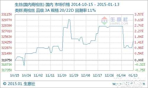 据生意社价格监测,1月13日3A级商检生丝价格重心在32.475万元/吨,价格较上周五相比,小幅上涨,涨幅0.39%。生丝原材料干茧价格重心在9.875万元/吨。