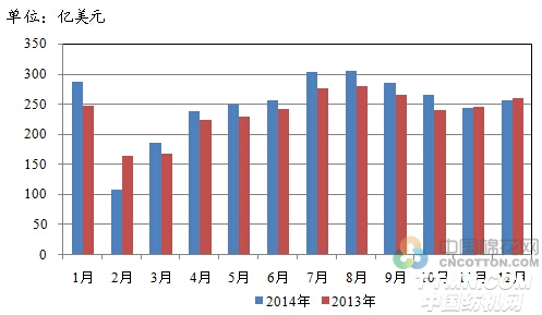 2014年我国纺织品服装出口额分月统计对比图 据中国海关总署最新统计数据显示,2014年12月,我国纺织品服装出口额为256.74亿美元,环比增长5.46%,同比下降1.24%。其中,纺织品(包括纺织纱线、织物及制品)出口额为97.54亿美元,同比增长0.17%;服装(包括服装及衣着附件)出口额为159.20亿美元,同比下降2.08%。 2014年1-12月,我国纺织品服装(指以上两类)出口额累计为2984.26亿美元,同比增加144.36亿美元,同比增长5.08%。其中,纺织品出口额累计为1121.41亿美元,同比增长4.86%;服装出口额累计为1862.85亿美元,同比增加5.22%。