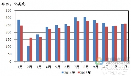据中国海关总署最新统计数据显示,2014年12月,我国纺织品服装出口额为256.74亿美元,环比增长5.46%,同比下降1.24%。其中,纺织品(包括纺织纱线、织物及制品)出口额为97.54亿美元,同比增长0.17%;服装(包括服装及衣着附件)出口额为159.20亿美元,同比下降2.08%。