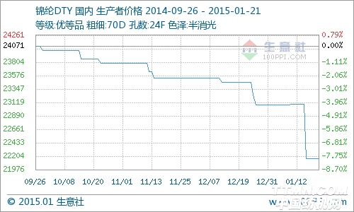 月21日,浙江地区某厂家锦纶DTY70/24F价格在21000元/吨,福建地区某厂家锦纶FDY40D/12F报价在22500元/吨,价格都较上周一致。原料市场价格最近价格暂稳,已内酰胺主流价在11800元/吨,价格较前期下调500元/吨,切片市场偏弱。