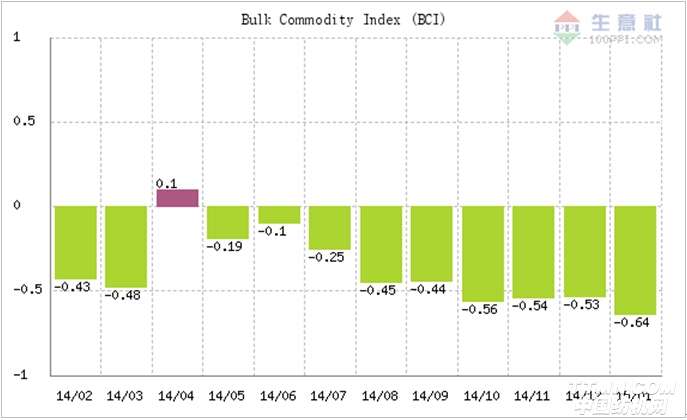 生意社最新数据显示,2015年1月生意社BCI指数为-0.64,均涨幅为-4.05%,反映该月制造业经济较上月呈收缩状态,经济仍处于底部运行,且下行压力增大。