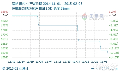 根据生意社价格监测,近期国内腈纶市场行情继续走跌,近三个月跌幅超过12%。目前国内腈纶1.5D短纤主流工厂报价在15750-16000元/吨。 华东地区丙烯腈装置重启,上游丙烯腈行情继续弱势阴跌,成本面塌陷。下游终端需求疲软,多数纱线品种成交偏差,且临近春节停工放假增加,腈纶市场年前成交好转有限。但目前腈纶厂家仍多限产降负,行业库存不高,对价格仍有支撑。生意社分析师认为,近期腈纶价格将继续呈弱势盘整为主。