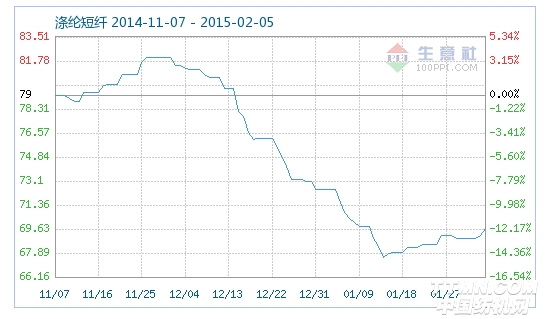 据生意社价格监测, 2月5日涤纶短纤商品指数为70.41,较昨日上升了0.72点,较周期内最高点101.81点(2013-09-04)下降了30.84%,较2015年01月14日最低点67.61点上涨了4.14%。(注:周期指2013-04-01至今) 目前,油价和PX持续大涨带动聚酯原料上行,涤短厂家涨价积极,低价货源减少,江浙1.4D直纺涤短市场主流报7100-7200元/吨出厂;福建1.4D直纺涤短市场主流报价涨至7050-7100元/吨短送;山东1.4直纺涤短主流报7250-7350元/吨送到。 生意社纺织分析师认为,短期内涤短厂家供货偏紧,部分涤短厂家处于负库存状态,欠货7-10天不等,商家惜售心态明显,下游补货积极性较好,若成本继续上抬,涤短报价跟涨的可能性较大。
