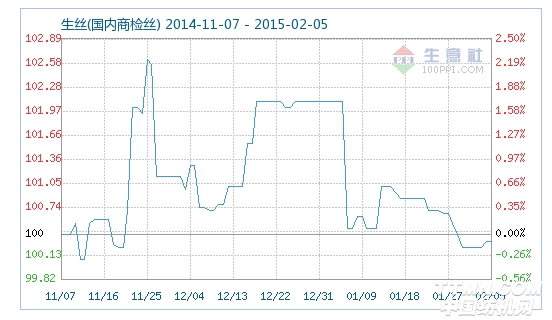 据生意社价格监测,2月5日生丝(国内商检丝)商品指数为100.31,与昨日持平,较周期内最高点121.00点(2013-07-23)下降了17.10%,较2012年01月03日最低点93.31点上涨了7.50%。(注:周期指2011-09-01至今) 目前干茧、生丝价格较为稳定格局基本维持不变随着春节的日益临近,各个厂商开始停产放假,减少原料采购规模,抑制了需求的增长,导致价格难有大的回升,维持区间震荡整理,而且消费端表现持续不乐观,预计节前茧丝延续区间弱势盘态势,整难有突破。