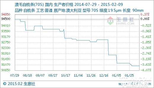 据生意社监测数据显示:1月29日澳毛自梳条70S商品指数为64.65,与昨日持平,创下周期内的历史新低,较2011年09月08日最高点100.00点下降了35.35%。(注:周期指2011-09-01至今) 2015年1月,大宗商品数据商——生意社发布的中国大宗商品供需指数(BCI)为-0.64,均涨幅为-4.05%,反映该月制造业经济较上月呈收缩状态,经济下行风险加大。 国内澳毛自梳条市场交易气氛不走,价格波动幅度不大,70s澳毛自梳条市场现价91200元/吨左右。生意社分析师认为,年末市场交易清淡,且厂家有资金回笼压力,毛条价格维持弱势。