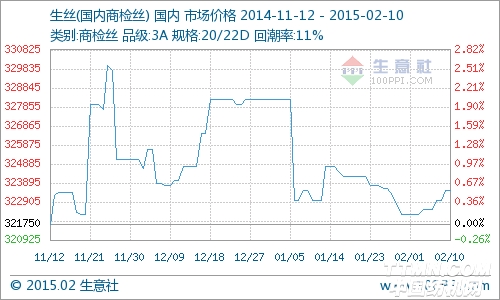 据生意社价格监测,2月10日生丝(国内商检丝)商品指数为100.62,与昨日持平,较周期内最高点121.00点(2013-07-23)下降了16.84%,较2012年01月03日最低点93.31点上涨了7.83%。(注:周期指2011-09-01至今) 各地生丝价格相对稳定,嘉兴茧丝市场3A级商检生丝报价在30.4-33万元/吨左右,广西茧丝市场3A级商检生丝报价在32.5-33.5万元/吨左右。 目前,临近春节,茧丝成交活跃度进一步减弱,供需双方呈现拉锯状态。基本面利空气氛较浓,谨慎观望为主,下游需求延续平淡,年底终端市场消费预期不佳,出口形式并不明朗。整体上,茧丝短期内仍会延续当前偏弱震荡走势。