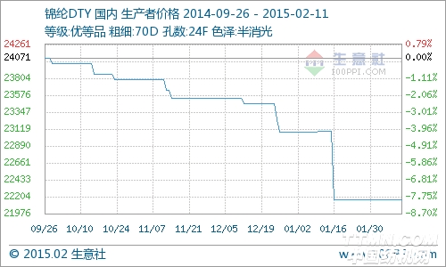 2月11日,浙江地区某厂家锦纶DTY70/24F价格在21000元/吨,福建地区某厂家锦纶FDY40D/12F报价在22500元/吨,价格都较前期一致。原料市场价格最近小幅回调,可是市场依旧疲弱。