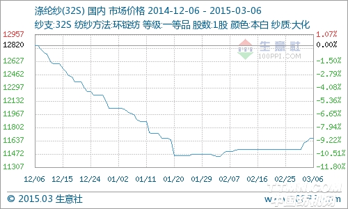 据生意社价格监测数据显示,本周(3月2日到3月6日)32s环锭纺纯涤纱价格小幅上涨,周末平均价格为11670元/吨,较周初价格11530元/吨相比,上涨1.21%。