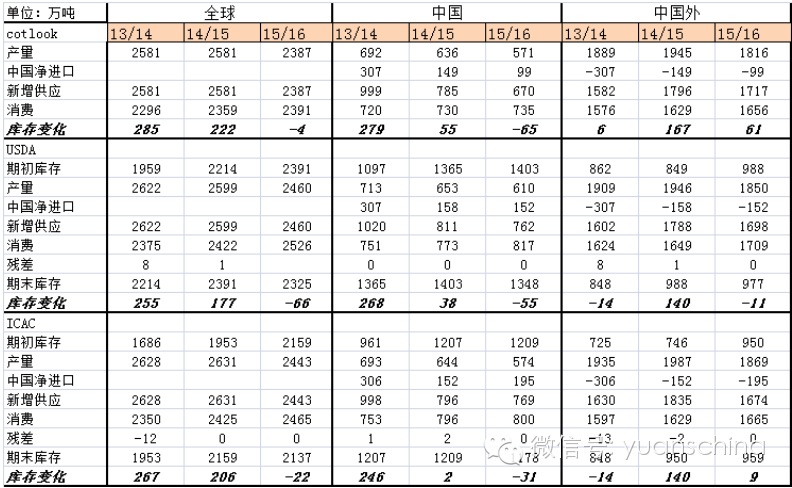 COTLOOK、USDA、ICAC均预测14/15年度全球棉花供大于求,棉花期末库存增加。尽管中国产量下滑,但加上进口量,总体仍是过剩格局,期末库存增至1209-1403万吨,除中国外的区域也是供大于的格局。对于15/16年度,三大机构普遍预计全球将面临产量下滑和消费增加,期末库存量将下滑。其中对中国产量的预计在571-610万吨,消费量预计在735-817万吨,期末库存下滑31-66万吨,结合中国国储近1200万吨的储备库存,中国棉花去库存化的周期仍很漫长。