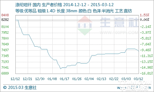 据生意社监测数据显示,3月11日涤纶短纤商品指数为72.39,较昨日下降了0.14点,较周期内最高点101.81点(2013-09-04)下降了28.90%,较2015年01月14日最低点67.61点上涨了7.07%。(注:周期指2013-04-01至今) 12日,涤纶短纤市场买盘气氛偏淡,成交商谈为主,江浙地区1.4D直纺涤短市场主流报7350-7400元/吨出厂;福建地区1.4D直纺涤短市场主流报7300-7400元/吨短送,个别品牌贸易商低价出货在7200元/吨附近;山东地区1.4直纺涤短主流报7450-7500元/吨送到。 上游油价下跌,打击市场信心,聚酯大盘观望气氛浓厚,PTA阴线收跌,PX行情继续走低;下游纺企采购量不大,买盘气氛欠缺,成交阻力明显。生意社分析师预计涤纶短纤行情稳中小跌