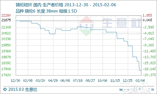 本周锦纶短纤价格上涨,浙江地区某企业锦纶短纤1.5D×38mm报价在20000元/吨。近期成本回升,价格偏涨。