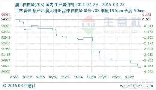 据生意社监测数据显示:3月24日国内澳毛条报价波动幅度较缓,其中70s澳毛自梳条价格维持平稳,现市场报价88000元/吨左右。 3月24日,国内澳毛条大多数产品报价趋弱,其中70s澳毛条价格出现稳中偏弱,江苏地区70s澳毛自梳条价格较低,现报价85000元/吨左右,市场交易不如预期。毛条厂前期合同以初步完成,毛条厂心态较平稳,新单执行价格维持弱势。下游毛纱国毛精纺纱在最近几天内报价平稳,而市场成交量却有回升现象,尤其是24支国毛精纺纱市场颇为走畅,闪光仿兔毛纱、羊仔纱市场近来出货量略有上升。由于春夏装T恤衫即将进入试产期,在本周内绢丝羊绒纱出现动销,其中,48Nm/285绢丝/15羊绒市场需求量较大。由于市场毛条需求较缓,库存积累增多,预计毛条价格将出现小幅度下跌。
