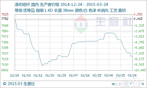 据生意社监测数据显示,3月23日涤纶短纤商品指数为69.06,较昨日下降了0.53点,较周期内最高点101.81点(2013-09-04)下降了32.17%,较2015年01月14日最低点67.61点上涨了2.14%。(注:周期指2013-04-01至今) 24日,涤短市场整体心态依旧偏空,整体疲弱,价格重心略软,各地市场报价稳中偏弱。江浙1.4D直纺涤短市场主流报7000-7100元/吨出厂;福建1.4D直纺涤短市场主流报6900-7000元/吨短送;山东1.4直纺涤短主流报7100-7200元/吨送到。 上游聚酯大盘整体心态依旧偏空,下游厂家采购热情不高,成交阻力很大。生意社纺织分析师预测后市涤短行情偏弱的可能性较大。