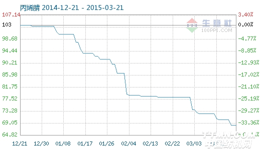 根据生意社价格监测,截止3月23日丙烯腈商品指数为68.35,与上一日持平,创下周期内的历史新低,较2014年11月24日最高点107.59点下降了36.47%。(注:周期指2012-10-30至今) 国内丙烯腈市场窄幅整理,主流工厂报价在9100-9700元/吨。传闻赛科新装置本周计划投产,其他丙烯腈供应维持高负荷开工,市场整体供应充裕。上游丙烯市场行情呈走弱迹象,截止3月23日丙烯(华东)商品指数为60.95,较上一日下降了0.05点;下游腈纶市场平淡盘整,对原料采购意向略增,市场利空气氛有所缓解。 生意社分析师认为丙烯腈价格跌至低位,厂商大幅降价的可能性不大,心态略有回稳。但随着新装置投产预期,市场供需面缺乏利好,预计丙烯腈行情稳中偏弱为主。