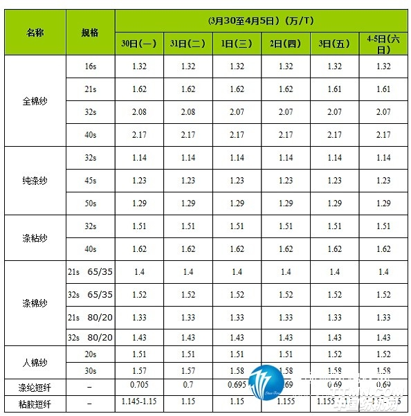 POY销售时断时续,价格走势震荡为主。本周POY加弹用丝需求尚可,属于清明节前补仓采购,但是清明节三天(4月4、5、6日)小长 假,POY丝加弹品种采购谨慎,销售情况稍有减弱,多F的POY丝出货可以,而POY丝拼网所用市场交易显得一般。但是最近阶段POY黑丝颇为俏销。