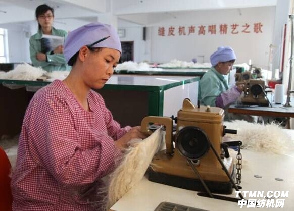 宁夏利通区毛纺织产业园区内,企业员工正在生产二毛皮坎肩。 近年来,利通区着力打造低碳经济先行区,建设毛纺织产业园,现已形成主要以绒毛分梳、纺纱、织布、针织服装、巾被、地毯为主的纺织产业经济带,园区被批准为第22个全国纺织产业转移试点园区。