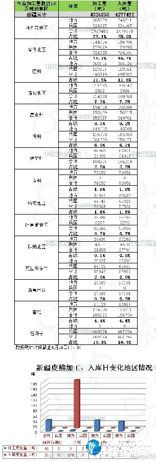 据统计,截至2015年4月16日,新疆地区累计加工皮棉4336850吨,入库4277422吨;其中兵团企业加工皮棉1697824吨,地方企业加工 2639026吨。4月15日只有阿克苏地区、巴州、伊犁州、乌鲁木齐四个地区皮棉加工、入库量发生变化。详情如下图: