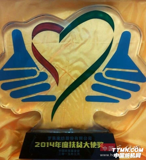 “中国扶贫基金会2014捐赠人大会”在北京国际会议中心举行。会上,中国扶贫基金会为2014年度做出突出贡献的机构代表和个人代表颁发了荣誉奖杯或荣誉奖牌,罗莱家纺因持续不断的善举,尤其是快速反应、紧急调拨物资驰援鲁甸灾区人民荣获“2014年度扶贫大使奖”。