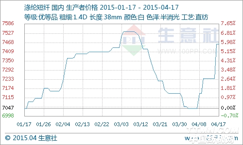 根据生意社价格监测显示,本周国内涤纶短纤市场价格扩幅续涨,成交明显放量,部分库存几无为零。受成本面行情上涨推动,周涨幅累计有500元/吨以上涨幅,目前江浙1.4D直纺主流报价涨至7600-7700元/吨出厂。福建地区主流报价7500-7600元/吨短送,山东地区主流报7750-7850元/吨附近送到。个别工厂封盘停报,厂商有惜售心态。 在国际油价暴涨至年度高位,以及上周腾龙PX装置爆炸余波的支撑下,成本面持续向好,PX、PTA周涨幅涨幅分别在0.39%、5.65%;因涨势迅猛,下游市场消化尚需时间,纱厂追高谨慎,盛泽地区市场纯涤纱部分品种报价上调100元/吨,成交量尚可。32S主流报价11900元/吨上下,45s主流报价12500元/吨附近。 生意社分析师夏婷认为,目前在PTA大涨之后,聚酯工厂跟涨力不从心,抵触PTA高价。另外翔鹭石化450万吨/年装置计划4月20日左右重启,台化宁波120万吨/年PTA装置计划4月底5月初重启,逸盛石化大连220万吨/年PTA装置计划5月初重启,所以5月份开始PTA现货过剩利空将终结PTA涨势,成本端存在走弱的可能性。下游来看,由于前期涨势迅猛,市场消化尚需时间,预计涤纶短纤市场整理为主。后期仍需关注PTA检修及走势情况。