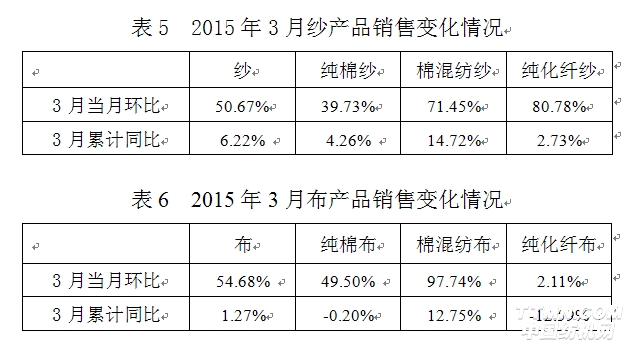2015年3月交易日多于2月,纱、布销售量环比上升;3月份纱、布累计销售量同比均有所增长,市场略有好转,订单有所增加,据协会调研了解部分企业订单已到2季度末。