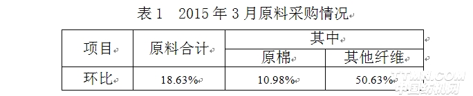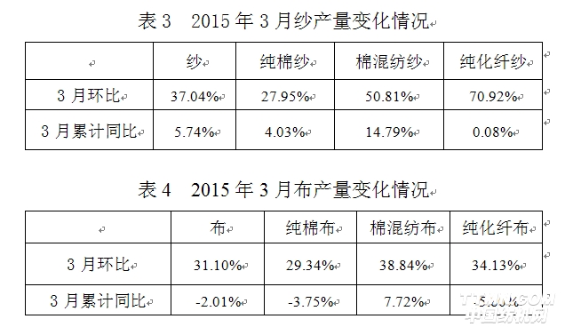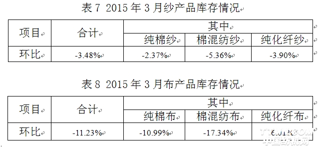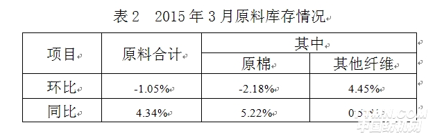 2015年3月与2月相比,工作日明显增加,棉纺织企业原料采购增加,库存减少;纱、布产品产量、销售量增加,库存量减少。