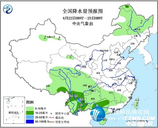 预报:4月22日08时至23日08时,新疆沿天山地区的部分地区有雨夹雪、西南地区大部、华南大部等地有小到中雨,其中,云南中西部和南部部分地区有大雨,局地有暴雨(50~55毫米),部分地区并伴有雷暴。东北地区西部等地有4~6级风。新疆南疆盆地的部分地区有浮尘。