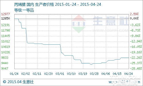 根据生意社价格监测显示,本周(4月20-24日)国内丙烯腈市场行情平稳,工厂暂稳价销售,主流报价在9500—10200元/吨。东北及山东地区丙烯腈供应偏紧,贸易商持货成本提升,报盘小幅探涨,推动市场重心上移。