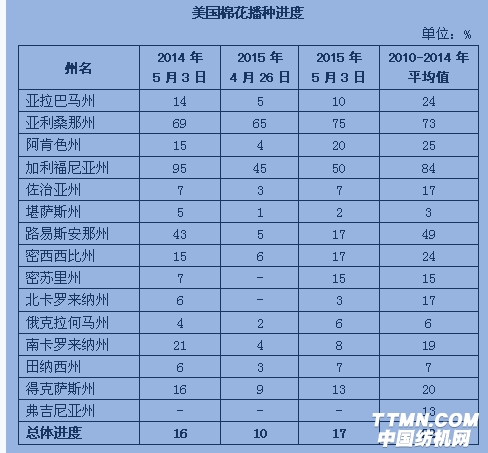 美国棉花生产报告:播种进度已超2014年同期